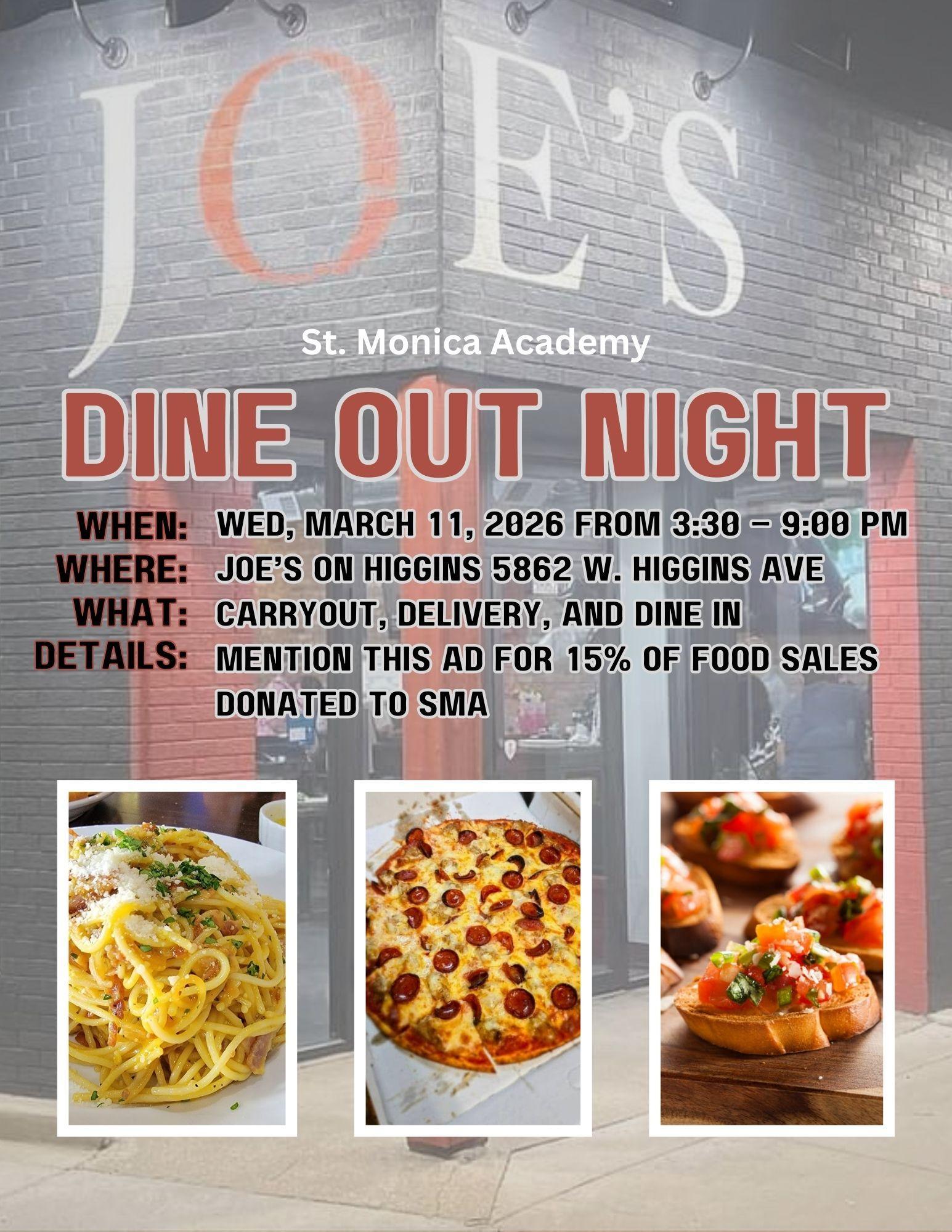 SMA Dine Out Night - Joe's on Higgins Join SMA for a dine out night on March 11, from 3:30 -9:00pm. 15% of proceeds will go to SMA.
