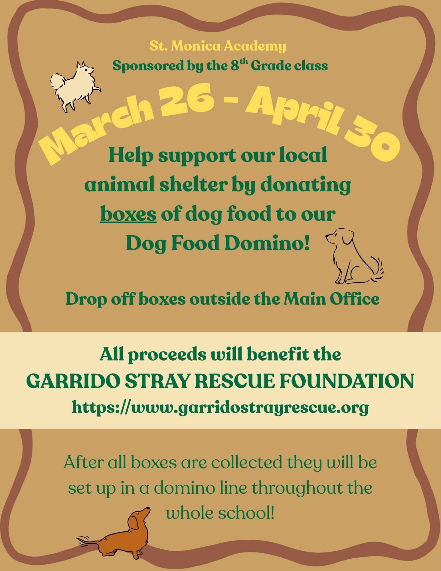 Donations are being collected to support Garrido Stray and Rescue foundation. SMA 8th graders as asking for boxes of dog food or treats where they will line up and create a domino set up in the building before sending the treats to Garrido Stray and Rescue to support their efforts for animals in the Chicago area.